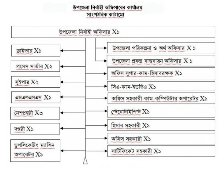 সাধারণত বাংলাদেশের সকল প্রশাসনিক উপজেলায় উপজেলা নির্বাহী অফিসারের কার্যালয়ের একইরকম সাংগঠনিক কাঠামো দেখা যায়। নিম্নে খুলনা জেলার দিঘলিয়া উপজেলার উপজেলা নির্বাহী অফিসারের কার্যালয়ের সাংগঠনিক কাঠামো দেওয়া হলো।